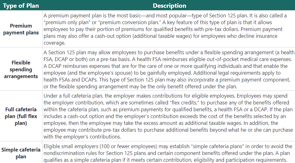 There are four different types of Section 125 plans that employers can choose from when setting up their cafeteria plans: