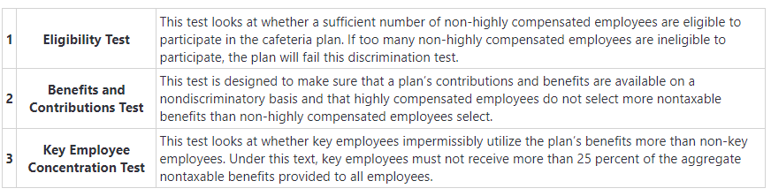 Section 125 plans must pass certain tests designed to ensure that the plan does not discriminate in favor of highly compensated employees. If a cafeteria plan fails to pass nondiscrimination testing, highly compensated employees lose the tax benefits of participating in the plan (that is, they must include the benefits or compensation in their income). However, even if a cafeteria plan is discriminatory, non-highly compensated employees will not lose the tax benefits of participating in the plan. In general, a cafeteria plan must satisfy the following three nondiscrimination tests: