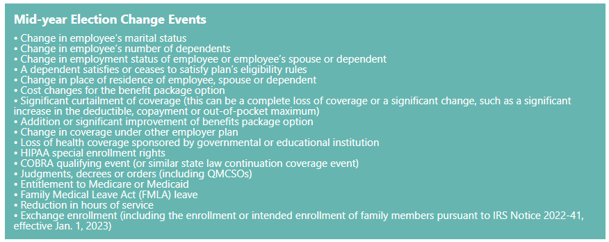 Cafeteria plans may recognize certain events where an employee is entitled to make election changes during a plan year. The IRS recognizes three broad categories of mid-year election change events: